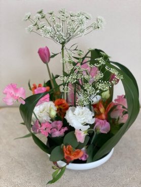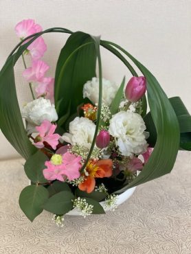 ハランを使ったアレンジメントです。春の花材がとってもかわいらしいですね。